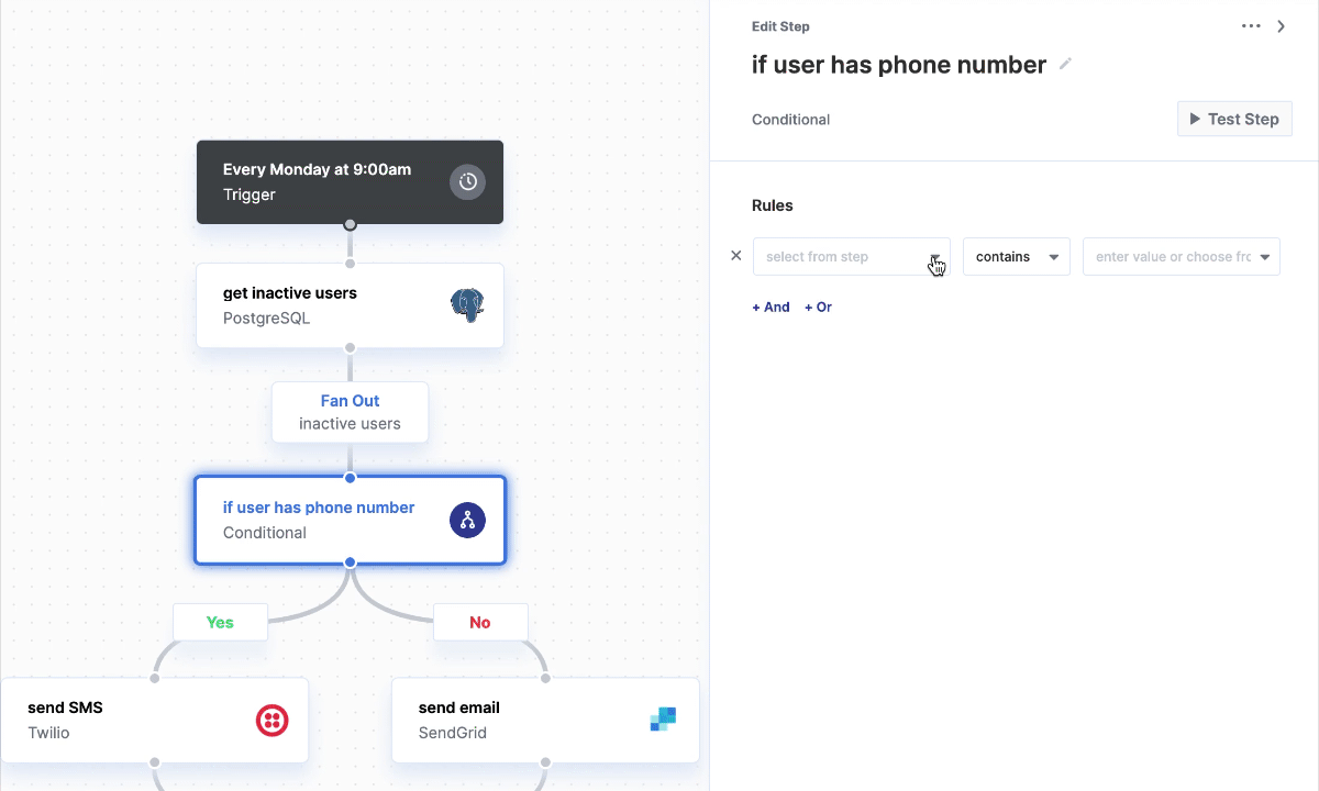 To add a rule to your conditional, click the dropdown menu in the ‘select from step’ input to choose a value that you want to evaluate. In the input to the right, you can choose a conditional operator (e.g. is true, equals, greater than).Note: Operators depend on the value’s type - for example, “greater than”