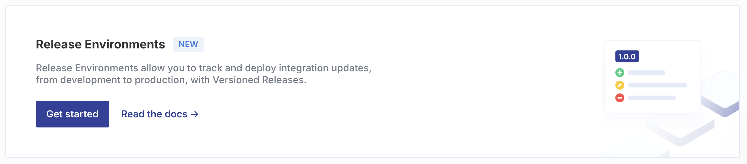 Start by navigating to your Paragon dashboard. At the end of your Integrations list, you will see a prompt to enable Release Environments. Click Get started.