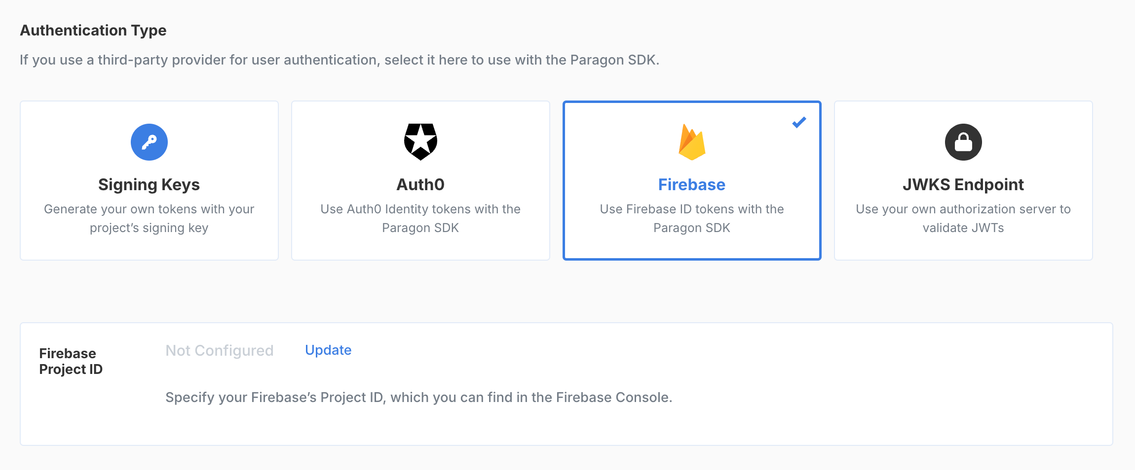 Before using the Paragon SDK, you’ll need to set up your application to verify the identity of your users to the SDK. Paragon verifies the identity of your users using the authentication system you’re already using, including managed services like Firebase or Auth0. Some backend code may be required if your application implements its own sign-in and registration.Generating tokens with your backend