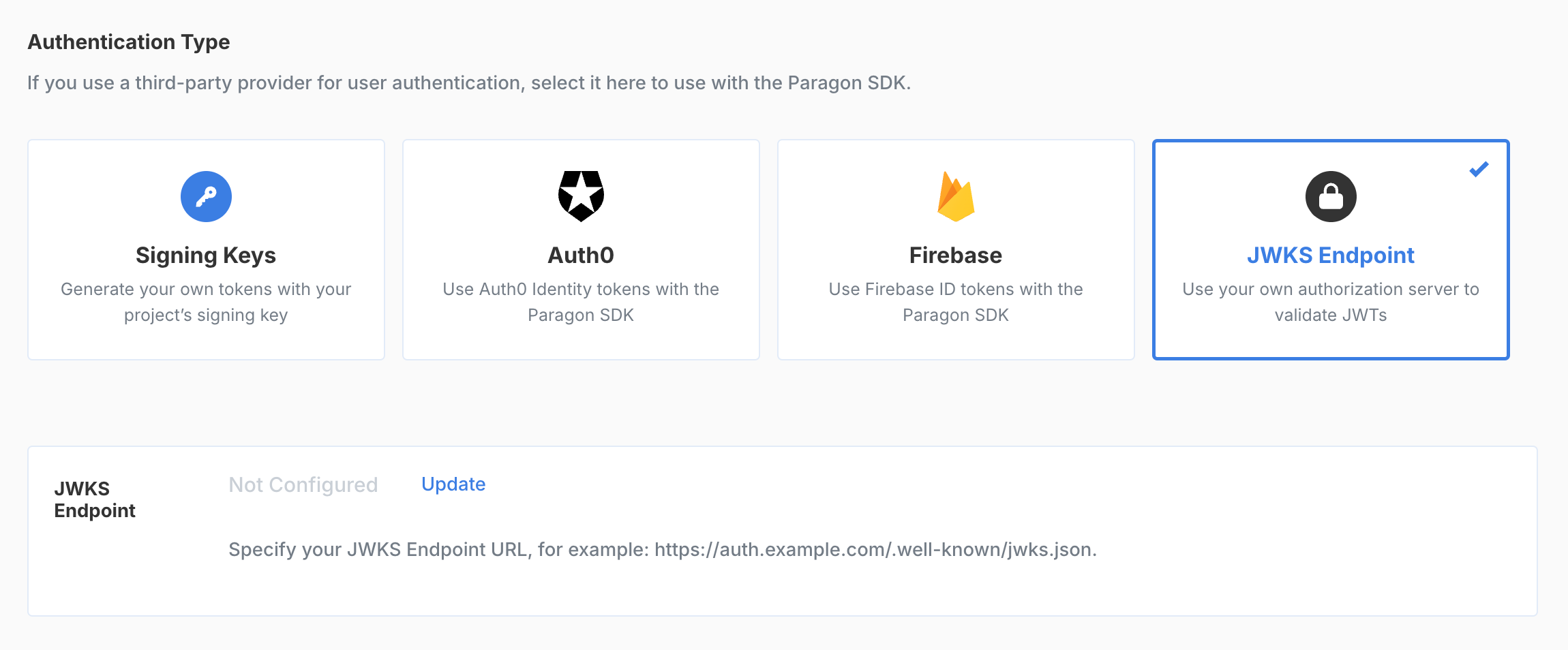 If you already use an authentication service like Auth0, Firebase, or a JWKS-compatible authentication server, you can set up your Paragon project to use tokens generated by that service by navigating to Settings > SDK Setup and selecting a provider.