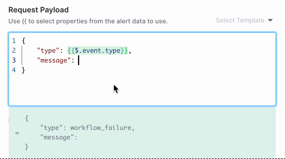 If you use Slack, Datadog, New Relic, or Sentry, you can configure a Webhook Destination by clicking “Select Template” under Request Payload and following the guide to configure below:Slack