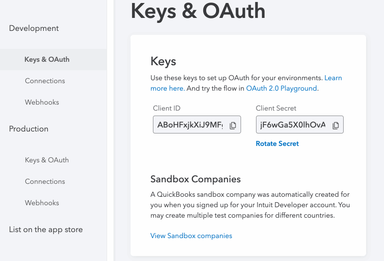- Client Secret: Found under Keys & OAuth > Keys > Client Secret on your QuickBooks App page.