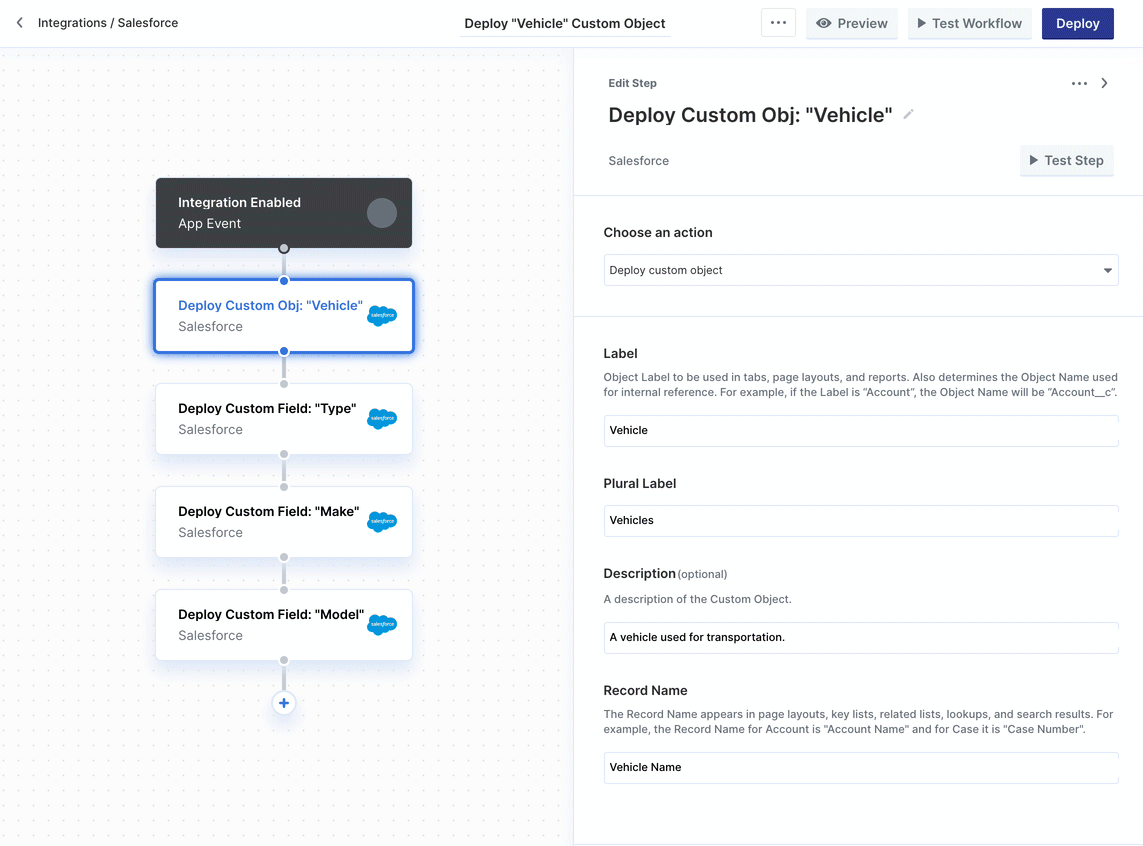 To deploy Custom Objects or Custom Fields to your users’ Salesforce instances, use the Deploy Custom Object or Deploy Custom Field Salesforce workflow actions. Both Deploy Custom Object and Deploy Custom Field will upsert by default, for example, if you run Deploy Custom Field on an existing Custom Field, it will apply any relevant updates to the Custom Field.