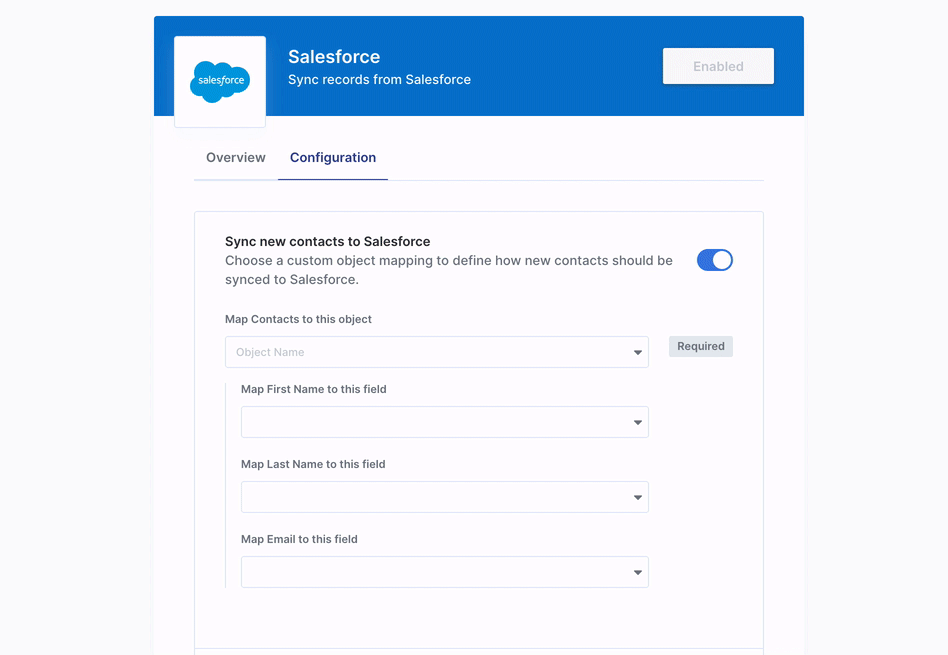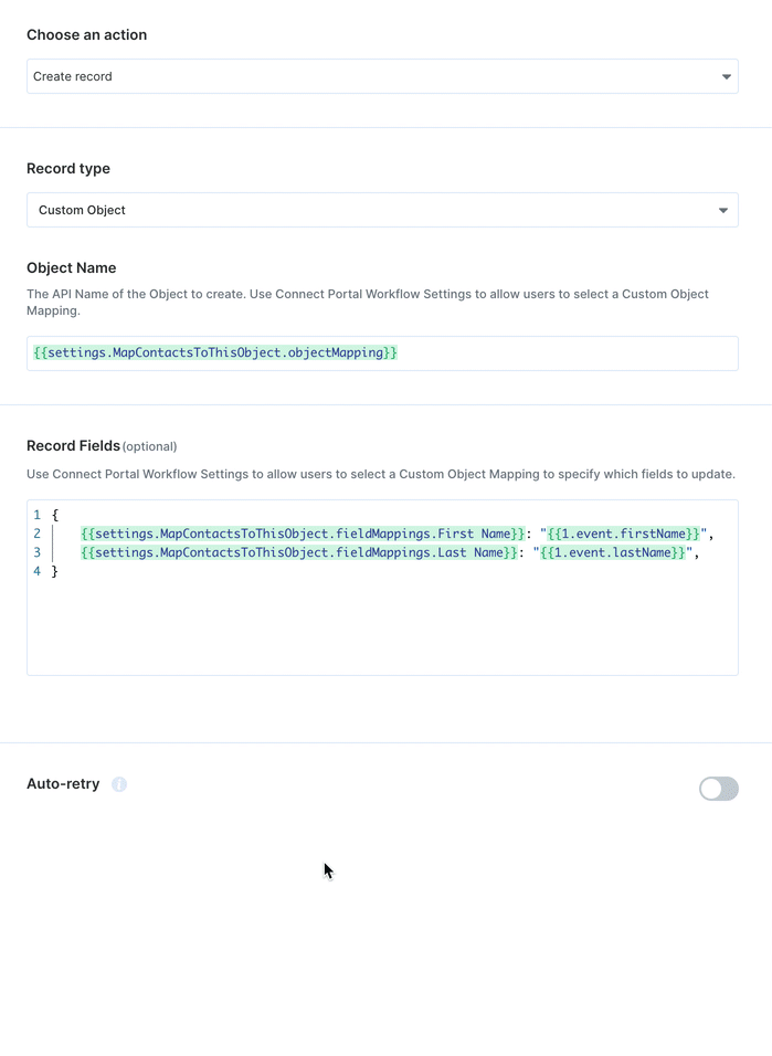 Below, add a label for each object property that should be mapped from your app to a Salesforce object field. In our contacts example, you might add labels for “First Name”, “Last Name”, and “Email”. In your Connect Portal, your users will be prompted to select an object from their Salesforce instance when enabling this workflow. For each of the object properties you labeled, your users will be prompted to select which object field that property should be mapped to. In the workflow editor, you can now access your user’s custom object mapping in the variable menu. For example: