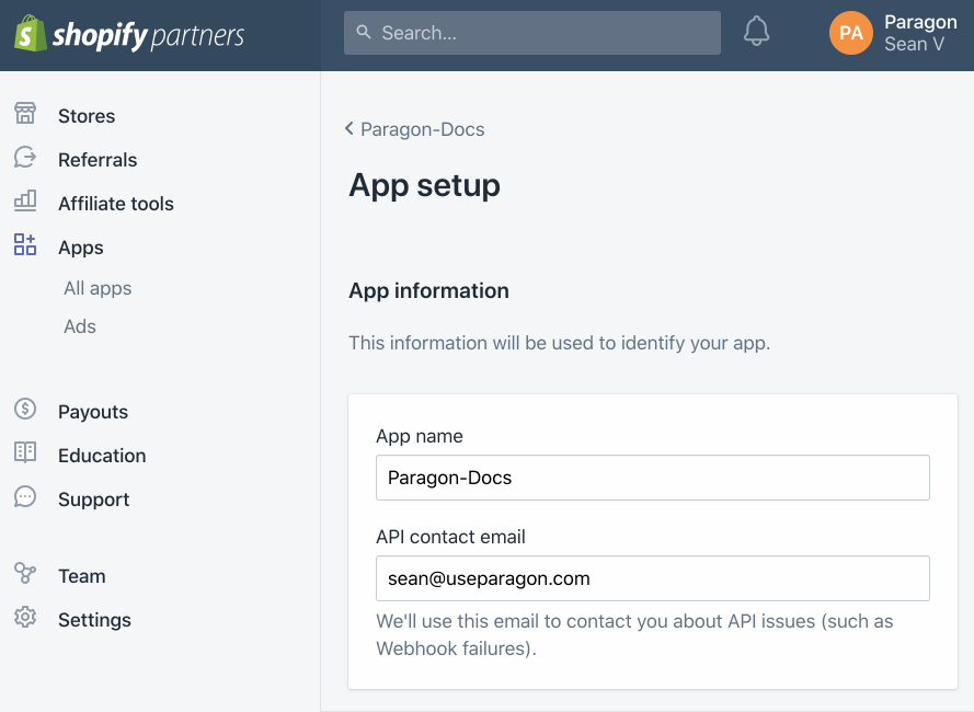 Paragon provides a redirect URL to send information to your Shopify app. To add the redirect URL to your Shopify app:- Log in to your Shopify Partner Dashboard and select your app.