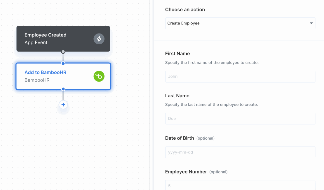 Add a BambooHR step to your workflow and use the dropdown menu to selectCreate Employee