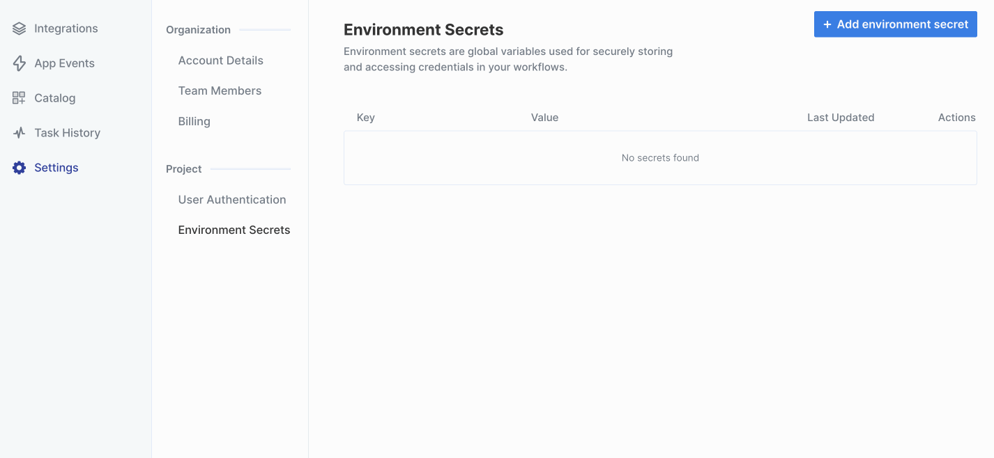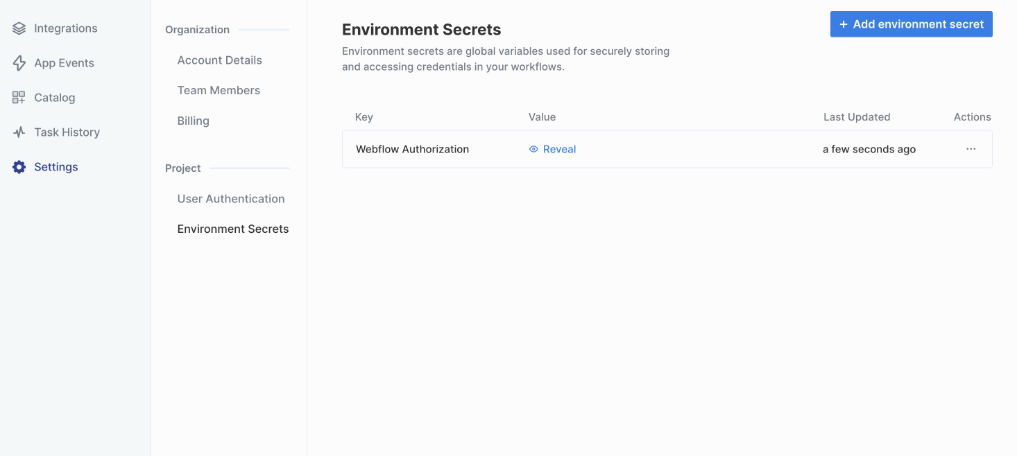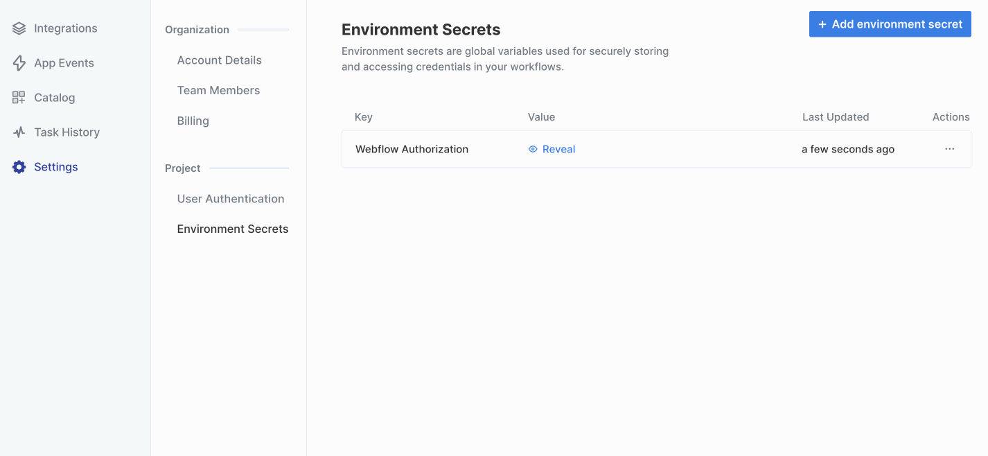 Environment Secrets are global variables used for securely storing and accessing secure values across your workflows. For example, you can store a global authorization token for your API to use in all Request steps that send a request to your API.Note: You must be an account Admin to manage Environment Secrets.