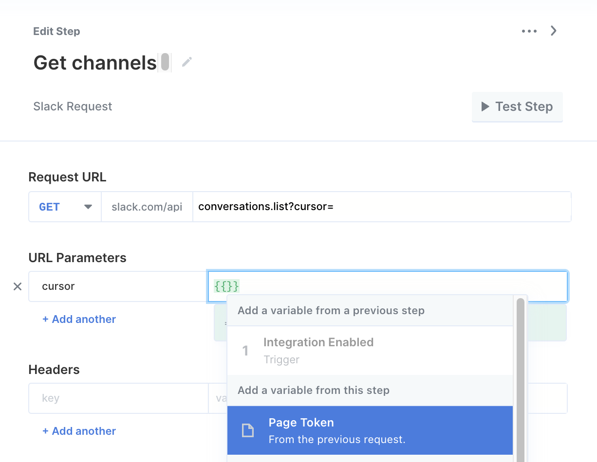 cursorquery parameter. Addcursorto the URL Parameters and use{{to open the variable menu and set the value to Page Token.