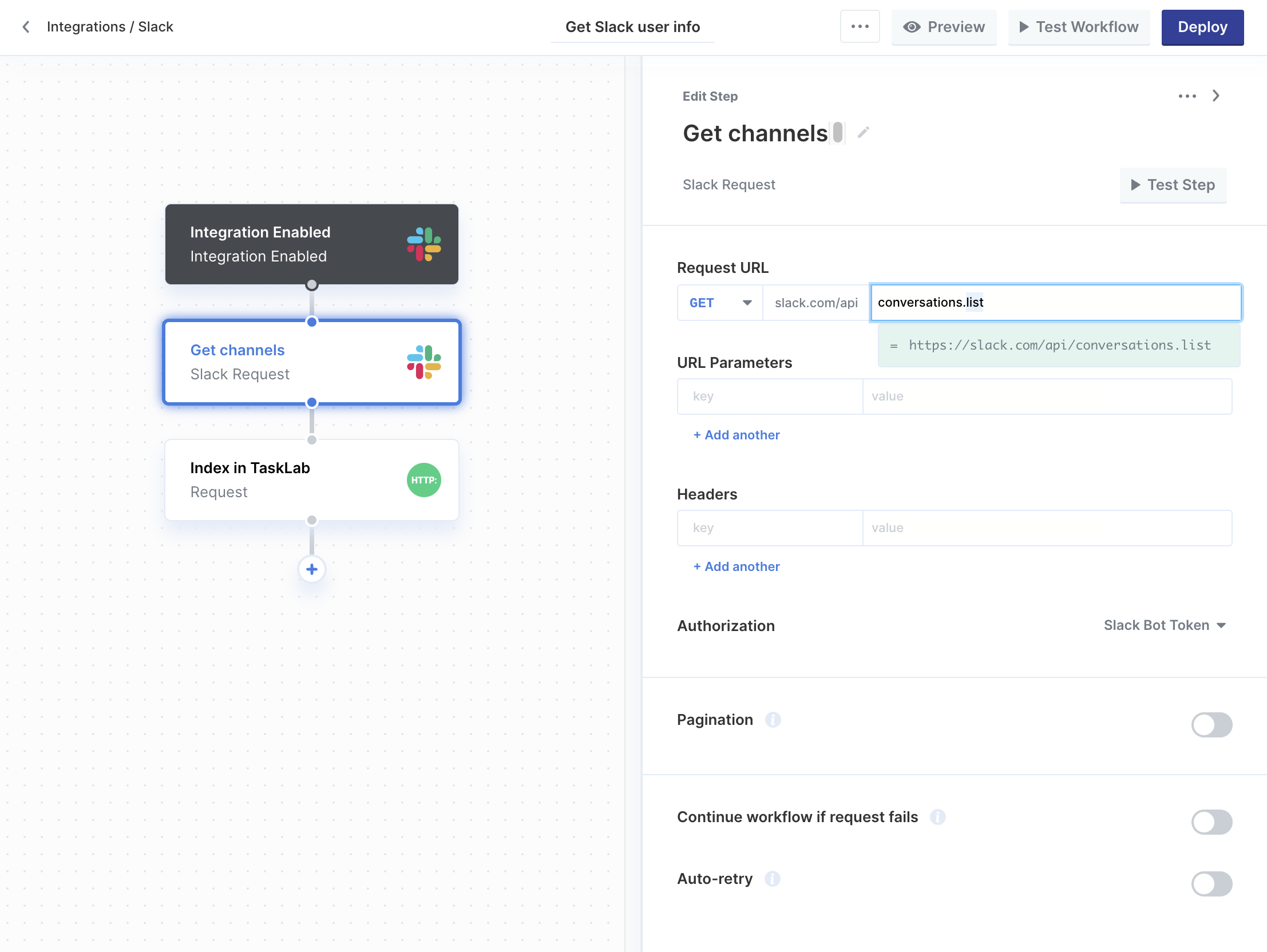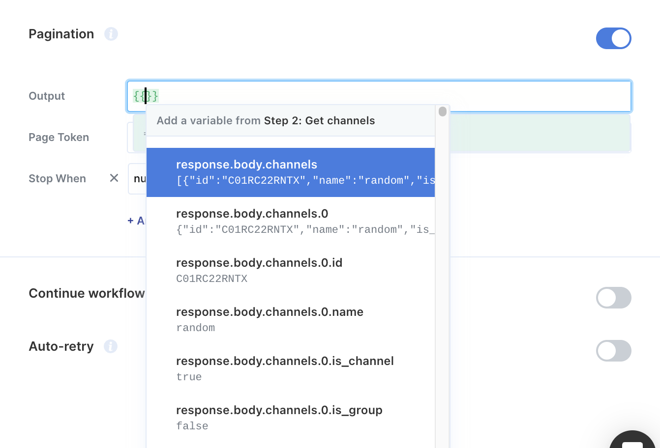 As an example of configuring Request Pagination, we’ll implement a workflow that uses Slack’s API to get all channels from a Slack workspace. The API endpoint we will use isconversations.list (see Slack documentation).