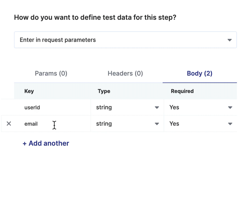 Manually entering request data is usually the best option if you know what data will be sent by the incoming request (e.g. you’re sending it from your own app). This option allows you to manually enter the expected query parameters (Params), headers (Headers), and body parameters (Body). Any data entered here can be used as variables by other steps in the workflow.