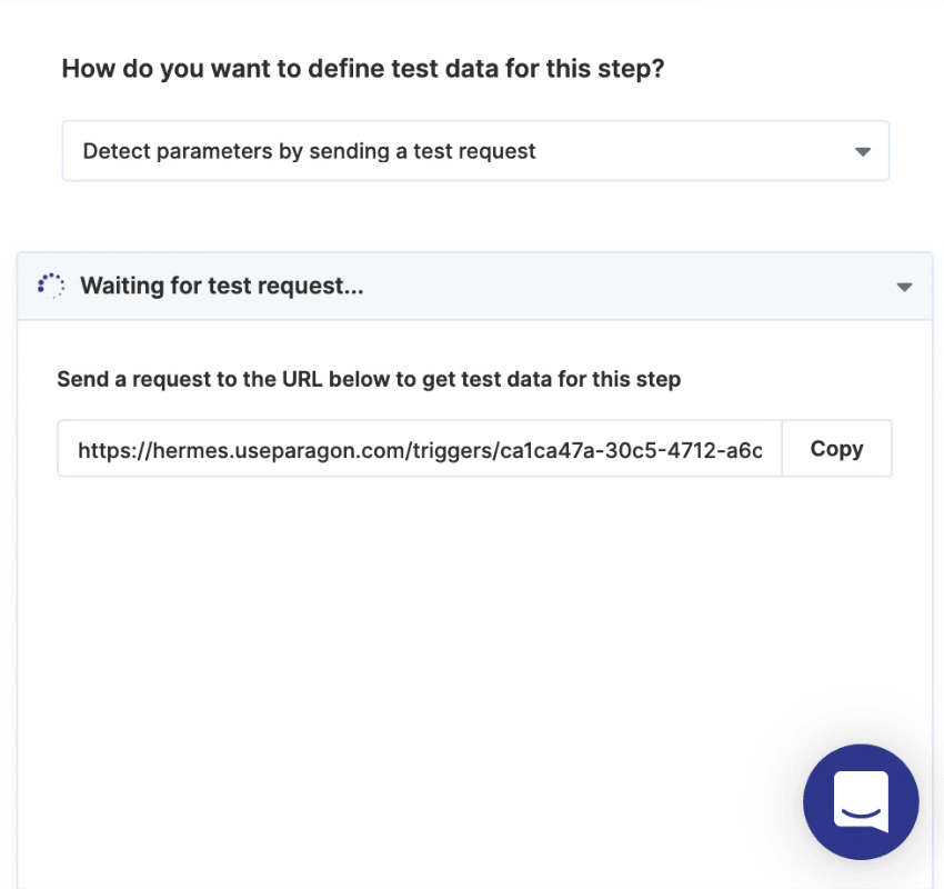 You can also choose to validate the incoming request data. For example, you can enforce that query parameters should be required, that headers should match an expected value, or that body parameters should match an expected type. If the incoming request doesn’t meet your workflow’s validation rules, the workflow will automatically return an error response. Automatically detecting data from a test request is usually the best option if you have a large amount of data to pass through. When you choose this option, the test shelf will appear and display a test URL at the bottom of the step sidebar. By sending a request to the test URL, Paragon will automatically detect data from the request and display it in the test shelf. Here, it’ll be saved as test data that can be used as variables by other steps in the workflow.
